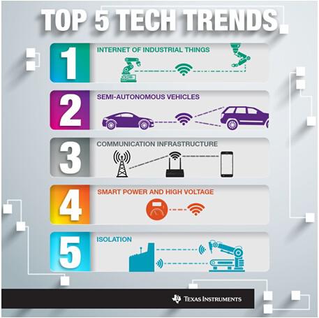在迎接2015到來之際,我們有必要花時間來評估和預(yù)測未來的一年中將會出現(xiàn)的技術(shù)挑戰(zhàn)和突破創(chuàng)新。通過與眾多戰(zhàn)略客戶、大學(xué)合作伙伴以及TI產(chǎn)品線的技術(shù)專家進行探討后,我們認為TI將在一些重要技術(shù)趨勢中發(fā)揮戰(zhàn)略性作用。這些技術(shù)趨勢正推動著汽車和工業(yè)等多個市場的發(fā)展,而在此過程中,TI的工程師將幫助應(yīng)對半導(dǎo)體技術(shù)領(lǐng)域的獨特挑戰(zhàn),并利用先進技術(shù)改善我們的生活。
